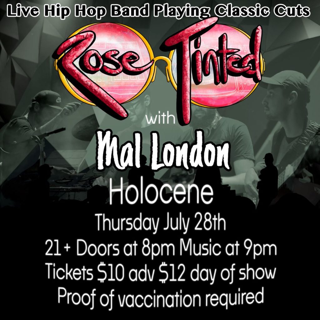PLEASE NOTE: For the safety of our customers, we will be requiring proof of full COVID vaccination (or negative rapid COVID test), to enter the venue until further notice. More details at holocene.org/vaccine Calling all hip-hop fans and beat heads! Rose Tinted is the hip-hop project you didn’t know you needed. The Portland-based band is back at Holocene on Thursday July 28. This show is part of their Spring and Summer residency, celebrating the very best hip-hop artists in the PDX scene. Through their residency with Holocene and co-presented by XRAY.FM, Rose Tinted strives to showcase and collaborate with Portland’s finest MC’s, beat producers, DJ’s, and R&B artists. This month’s edition features Mal London! Rose Tinted is dedicated to producing live-sampled beats, flipping classic hip-hop joints to pay tribute to the classic boom-bap sound. Rose Tinted provides hip-hop lovers with the nostalgia of their favorite DJ set combined with the incredible musicianship and creativity. If you consider yourself a hip-hop fan, you should get used to making their monthly residency a regular hang.