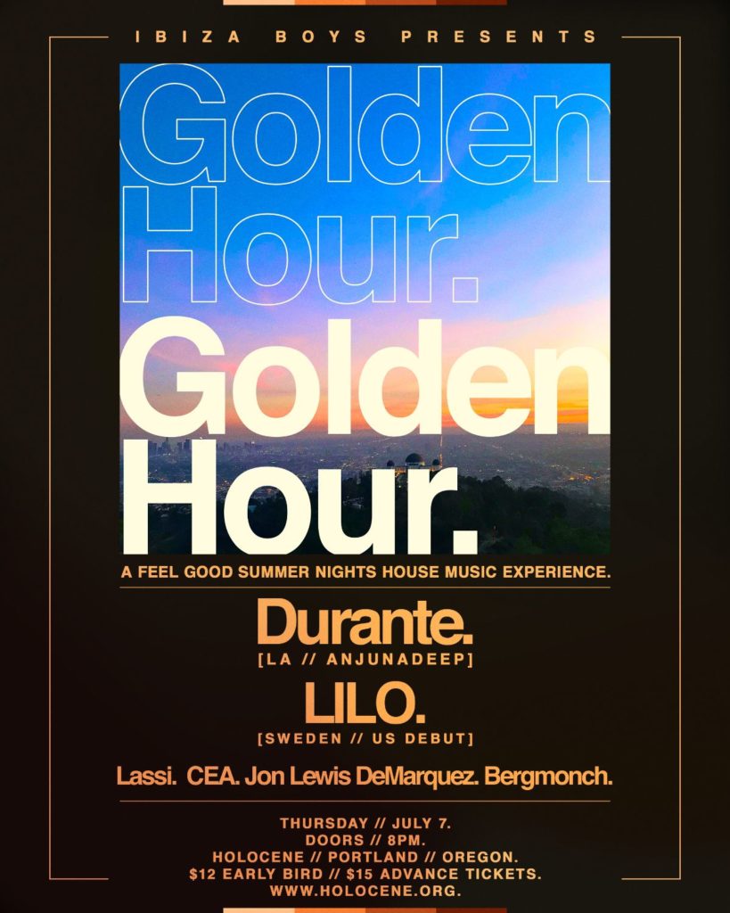 PLEASE NOTE: For the safety of our customers, we will be requiring proof of full COVID vaccination (or negative rapid COVID test), to enter the venue until further notice. More details at holocene.org/vaccine Ibiza Boys presents:Golden HourA feel good summer nights house music experiencefeaturing:Durante(LA, Anjunadeep)LILO(Sweden, US debut)Lassi CEA Jon Lewis DeMarquez BergmonchFollow Ibiza Boys on Instagram!: @ibiza_boyssA PORTION OF TONIGHT’S PROCEEDS WILL BE DONATED TO PLANNED PARENTHOOD.