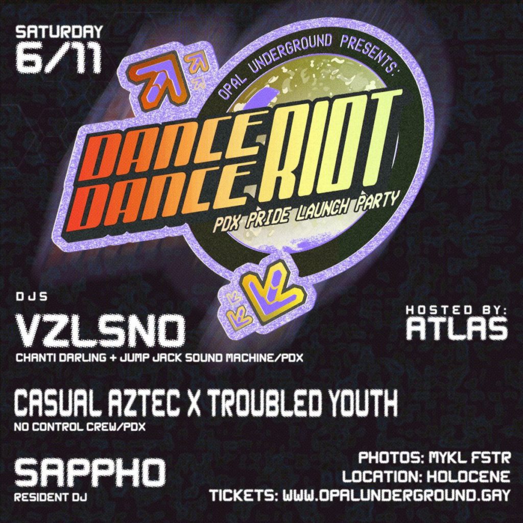 Opal Underground presents: DANCE DANCE RIOT – PDX PRIDE LAUNCH PARTY w/ VZLSNO, Casual Aztec x Troubled Youth, Sappho – 21+