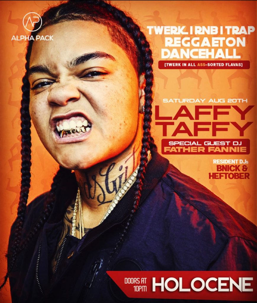 PLEASE NOTE: For the safety of our customers, we will be requiring proof of full COVID vaccination to enter the venue (or negative rapid COVID test) until further notice. More details at holocene.org/vaccine Alpha Pack Presents: Laffy Taffy – Twerk In all Ass-sorted Flavors Twerk | Trap | R&B | Dancehall | Reggaeton Nonstop sounds that are guaranteed to keep you sweating on the dancefloor. Laffy Taffy features resident DJ BNick (Blow the Whistle/Solid Gold/The Get Down/AirPlane Mode); featuring monthly rotating guests. Music will have NO boundaries, but it will be ALL fuego!!!! Heavy hitting Twerk 808s, ratchet Trap anthems, pulsating Dancehall favs, and GROUNDBREAKING Reggaeton bangers!!! This party will not disappoint. Advance tickets and Before 11pm at the door: $10 After 11pm at the door: $15 Resident DJs: BNick & HeftoberGuest DJ: FatherFannie