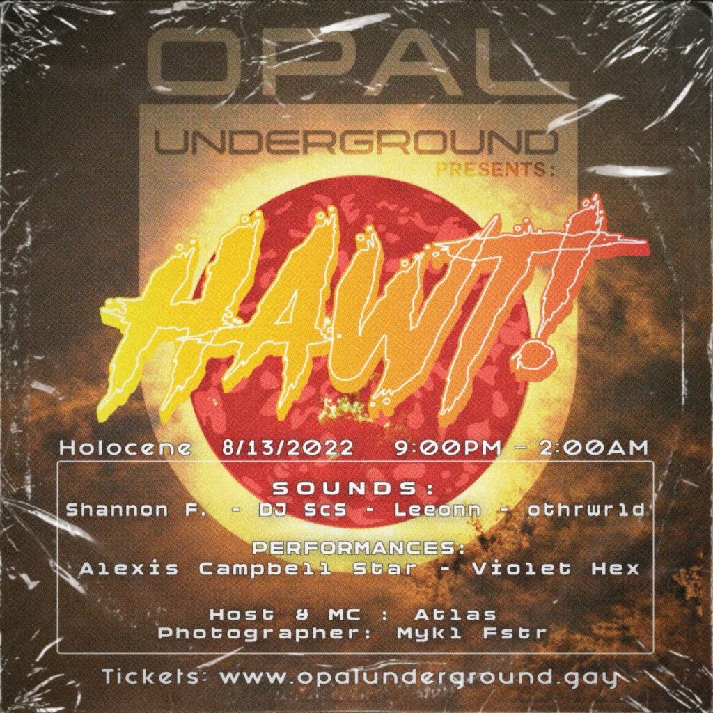 PLEASE NOTE: For the safety of our customers, we will be requiring proof of full COVID vaccination to enter the venue (or negative rapid COVID test) until further notice. More details at holocene.org/vaccine DJs : Shannon F (of Light Asylum) DJ ScS Leeonn othrwrld Performances by: Alexis Campbell Starr Violet Hex 🎤Host & MC : Atlas 📸Photographer: Mykl Fstr ☀️Summer Heat: It’s been a HAWT Season and we invite you to feel the joy of the A/C of Holocene while heating up the dancefloor and being treated to amazing performances by some of Portland’s best Drag Performers. THE VIBE: Let’s bring our HAWT Queer Summer looks and vibes and turn it out this night of Opal Underground. THE SOUND: Techno & Club music will be on the menu. We promise, you’ll get your fill. THE CROWD: This is a queer-run event that centers the safety and needs of Portland’s LGBTQ+ communities. Supportive and respectful allies are welcome. Consent: Anything other than yes means no. Consent is never coerced or forced. Incoherent people can not give consent. Consent is negotiated through each interaction. If you experience any hate or harassment, please report it immediately to Holocene’s security staff. For LGBTQ+ community members experiencing economic hardship, a dedicated tier of discounted tickets is available. Please send an email to info@opalunderground.gay for more information.