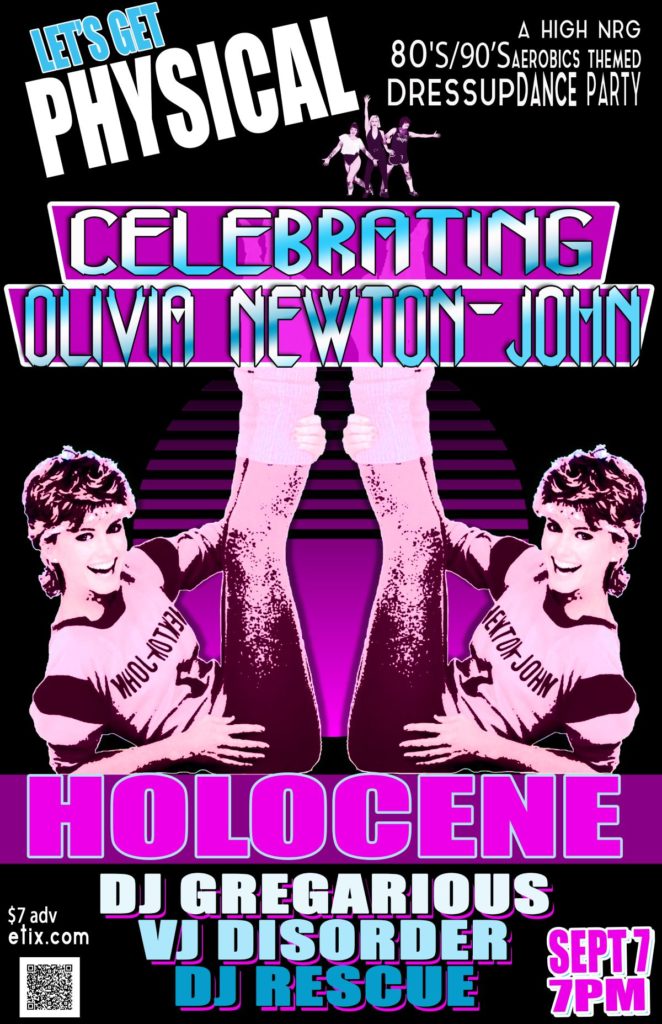 PLEASE NOTE: For the safety of our customers, we will be requiring proof of full COVID vaccination to enter the venue (or negative rapid COVID test) until further notice. More details at holocene.org/vaccine It’s only fitting that Let’s Get Physical celebrate the life and music of Olivia Newton-John. Join us for a night on the dancefloor full of Olivia Newton-John songs, edits and remixes, and related artists and styles, all selected by the team of DJ’s Gregarious & Rescue with VJ Disorder playing ONJ videos and related footage on the projectors. Come early for an aerobics INSPIRED dance night… Dress up in your best (worst?) over-the-top workout gear. (Think ugly sweater party in obnoxious spandex).DJ Rescue PUMPS you up while DJ Gregarious brings the Hi-NRG 80s/90s Jamz & VJ Disorder plays inspirational and hilarious retro workout videos. Emphasis on the 3 fundamentals: DANCING, PARTYING, and OUTFIT First up,LET’S GET PHYSICAL7-9:30pmGet your retro party workout in! Then on to the,Olivia Newton-John Celebration9:30pm-MidnightA 70’s/ 80s / 90s ONJ inspired dance party.(One ticket/cover change gets you in to the whole night of fun)